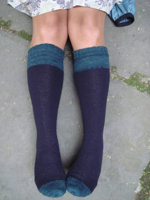 These socks were an early birthday present to myself. I had been wanting to make them for close to two years. In fact, they were the sole reason I purchased Nancy Bush's book, Folk Socks. I made some modifications, inspired by my friend Okay Knits (ravlink). As written, the pattern makes mid-calf length socks, which I feared would make me feel crazy, and I had two skeins (approx 800 meters) of the Cascasde Heritage that I'd purchased at The Point's going-out-of-business sale last spring, so I decided knee-high was the length. The Jitterbug was also purchased on sale last fall. I though the colors would go well together, which they do. However . . .they are rather close tonally, so the diamond-dot colorwork at the top is a bit obscured. I'm not too troubled, however, as I'd like to make them again. Next time I'll just pick colors that contrast more starkley.